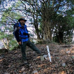 一旦車道に出て高見峰の登山口に取り付いた。緩い稜線を快適に歩いていたが小ピークを越えた辺りで岩場が現れ急傾斜になった。小高見峰は樹林帯に囲まれピークもハッキリしない地面に刺さった指標だけが唯一の目印なので赤テープがなければ辿り着けないと思う。