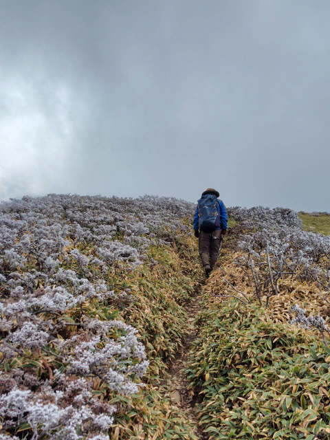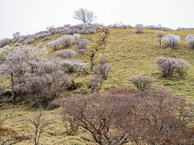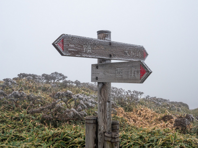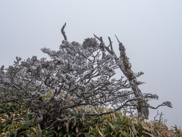周囲がガスに覆われ、冷たい風が強くなり底木樹氷ができていた。