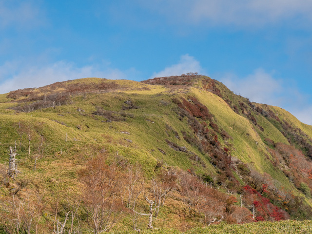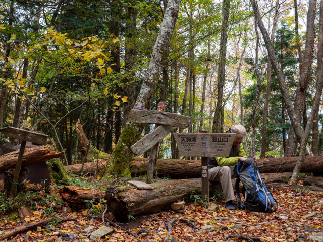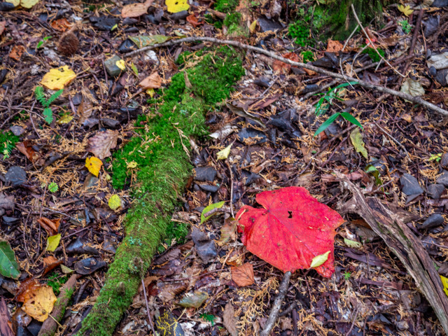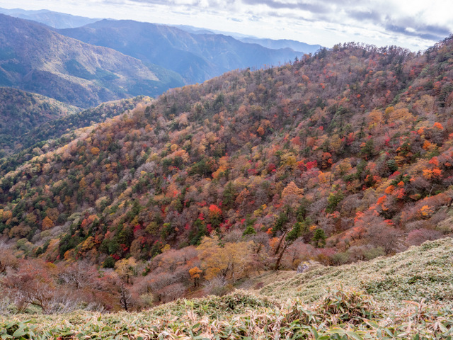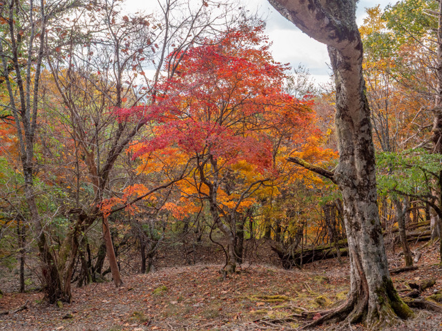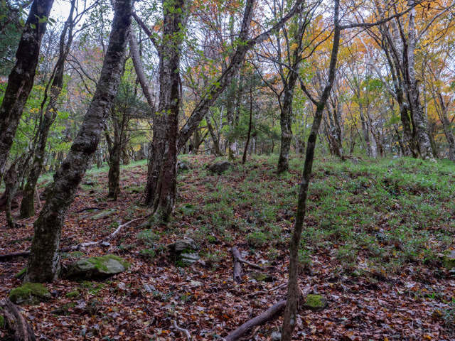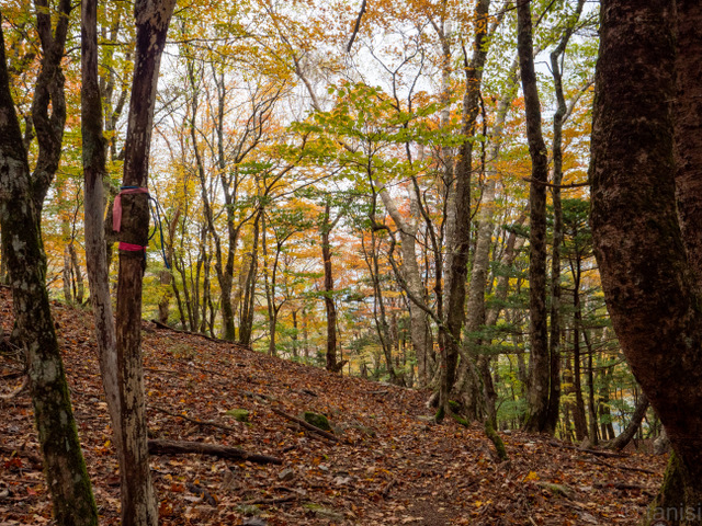 地面に笹が見え始めると一旦緩んだ傾斜が再びきつくなる。紅葉が賑やかになってきたのはこの辺りから、紅葉前線のピークは標高1500~1600mだろう。