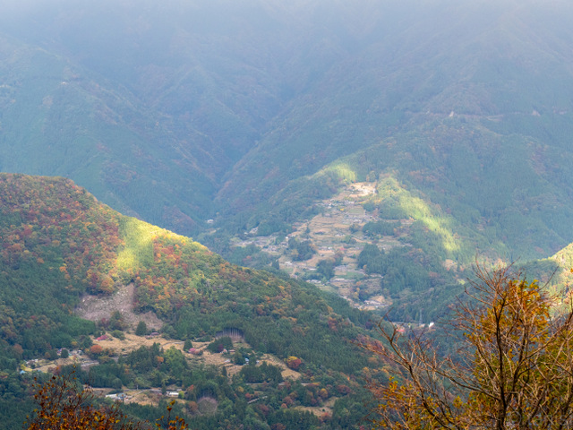樹林帯を抜けると見通しが利くようになる。正面は、近年有名になった落合集落、山の対面に展望所ができている。