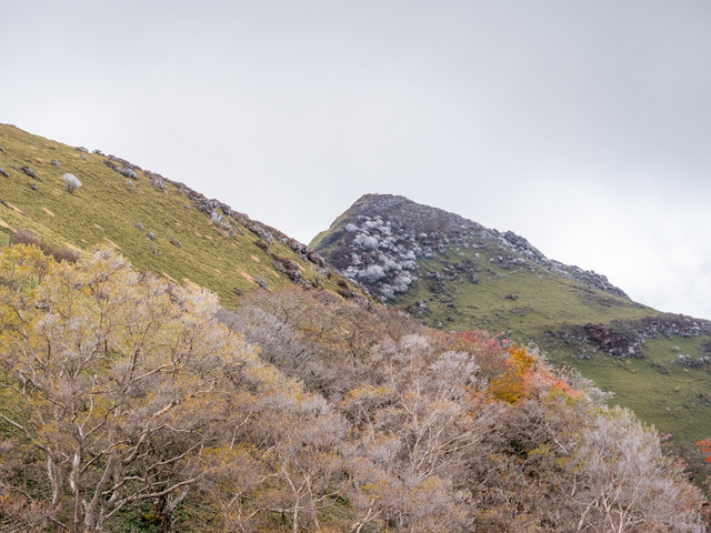 風が吹きなかなか明るくならなかったけど青空が見え始めたので登り出した。登山道入り口に紅葉がチラホラ見えて期待ができそうだ。