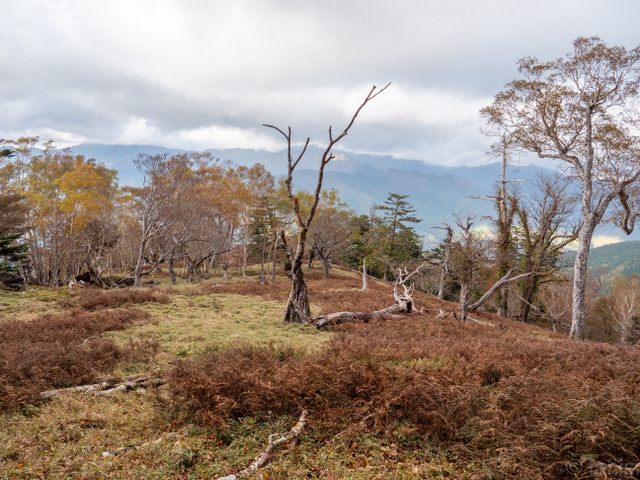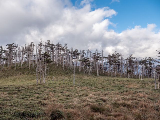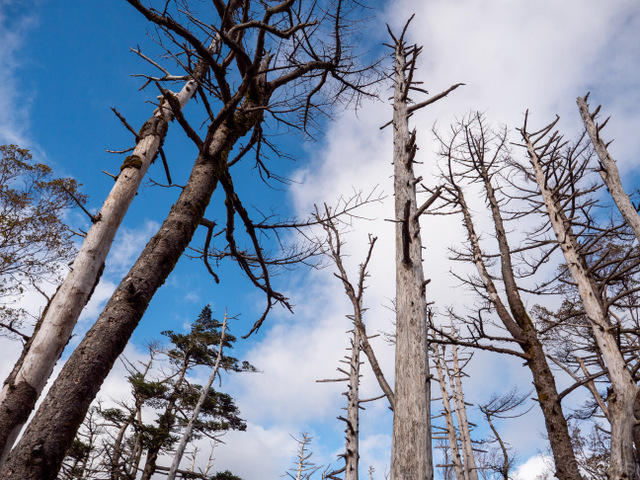 白骨林が目立ちだした笹原の奥に白骨林と葉をつけた針葉樹が並ぶ森