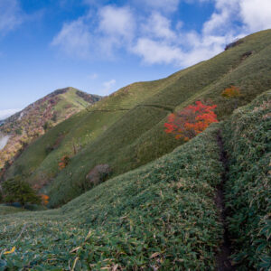 地面に笹が見え始めると一旦緩んだ傾斜が再びきつくなる。紅葉が賑やかになってきたのはこの辺りから、紅葉前線のピークは標高1500~1600mだろう。