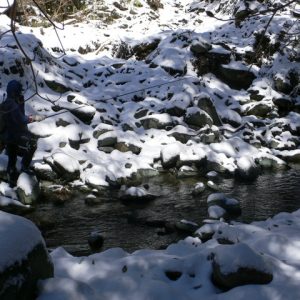 林道橋の渕で大物のアタリがあった、まだ上流に期待が持てるが納竿とする、まだ残雪があった