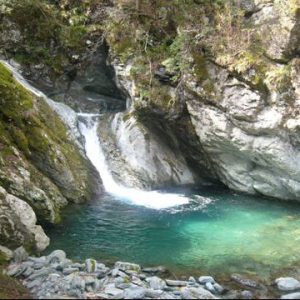 右横から滝に到着すると真中手前に大岩が横たわっている、滝は直漠ぎみで飛沫が少なく釣り易そうだ、水流は扇状に広がって流芯が大岩のエグレへ勢いよく巻き込んでいる、水深は4mといったところか?青く深い。
