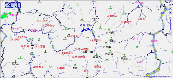祖谷川下流の23.若宮谷・24.日浦の谷・26.川崎の谷にもアマゴが確認できます。