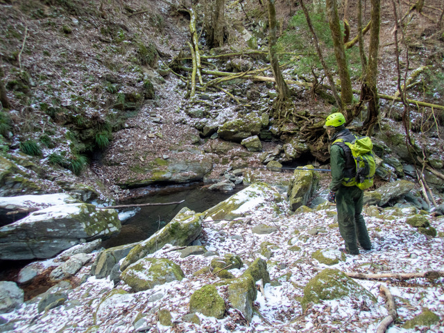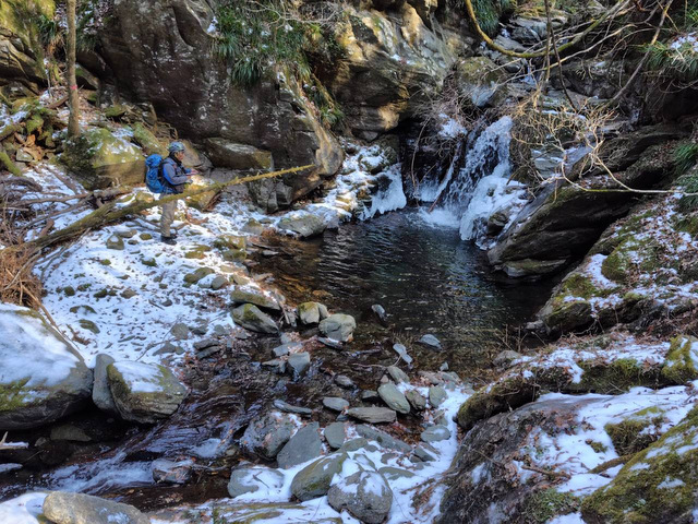 | 谷筋も積雪は大したことがない。 しかし、靴の裏にくっ付いた雪は凍り付き石の上に乗ると慣性ゼロで滑って危険だ。水の中に入り靴底の雪を溶かそうと思うのだが0℃に近い水温は氷の塊になるだけだった。 一面の雪世界の方が靴底との密着度が上がり普段は登るのが無理だと思われる斜面でもアプローチできるので中途半端な雪より安全だと思う。。 |