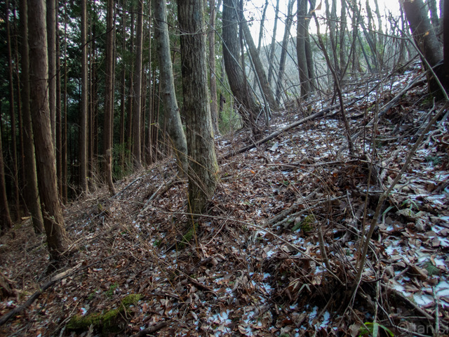 | 急斜面の植林を下る。 雪は疎らにある程度、それより乾いた落ち葉に踏ん張りが効かず転げ落ちそうだった。 |