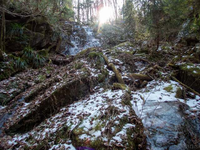 | 天気はいいが寒い。 幅の狭い渓筋にお日様の日差しが下流から迫ってくるけど、上流に釣り上がっている我々には届いてくれない。なんか暖かくなるのが嫌で日差しから逃げているみたいだったがそんなことはない。 |