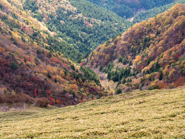 ![]() 次郎笈中腹から見た祖谷川支流の植生 |