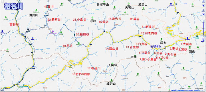 | 祖谷川の釣り場 エンテ釣りになりますが名頃ダムのバックウオーター5.イゴウ谷~1.大剣谷の間の本流は意外と大物が出ることがあります。しかし、車道が近いので上流に釣り人が入られることを覚悟しておいた方が良いと思います。(丸石の奥祖谷かずら橋周辺は禁漁区だったよう記憶があります。) 名頃ダムより上流の1..剣谷~6.唐谷は取水による減水の影響がなく、傾斜がそれぼどキツくないので釣りやすい谷になっています。ただ、この辺りは釣り人の往来が多い激戦区で放流しても直ぐ釣りきらてしまうのか下流域は魚影が薄いのが現実です。 昔、最高の釣り場だった7.四ツ小屋谷は三嶺の崩落によって源流部が大岩で埋まり、南尾根の崩落で土砂流入を食い止めるために10基以上の大型エンテが立ち並び渓流竿では太刀打ちできないようになりました。ルアーならなんとかなるでしょう。 ダートの荒れた林道を厭わないのなら12.霧谷が選択肢に入ります。標高900mにある取水口の上で水量が復活します。13..落合谷も取水口より上が釣り場になりますが谷の長さが1/3になります。 16.鎖谷と21.小島谷は車止めまで道が舗装されてから釣れなくなった谷です。源流部に釣り人が押し寄せると魚影が薄くなる典型例です。 祖谷川下流の23.若宮谷・24.日浦の谷・26.川崎の谷にもアマゴが確認できます。 |