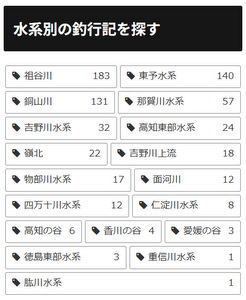 | 渓流釣り遡行記を水系毎に分類し釣行日順でまとめました。 これはWordpressテーマCocoonの機能『タグ検索』を使ったもので四国の渓流釣りモバイルにリンクします。四国の渓流釣りモバイルにはサイドメニューと本文下に『水系別の釣行記を探す』のウィジェットを用意しています。 なお、最新年度の渓流釣り遡行記は筆者意図の都合で分類に含まれませんので留意してください.。 ※( )の中は釣行記の数です。 |